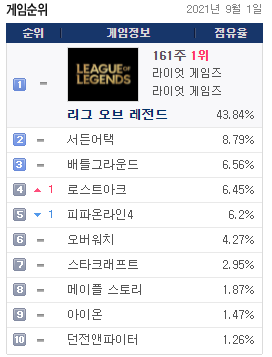 [2021년9월1일]pc방 게임점유율 및 pc방 게임순위, 1위-롤(LOL)