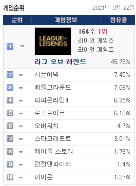 [2021년9월22일]pc방 게임점유율 및 pc방 게임순위, 1위-롤(LOL)