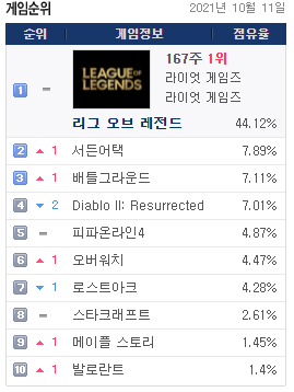 1.리그오브레전드 43.21% ▶ 44.12% (↑0.91%)