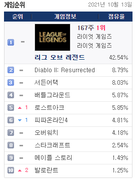 1.리그오브레전드 44.12% ▶ 42.54% (↓1.58%)