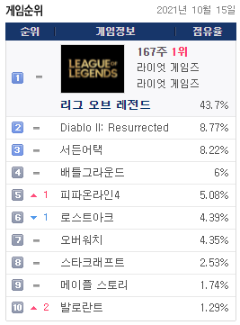 [2021년10월15일]pc방 게임점유율 및 pc방 게임순위, 1위-롤(LOL)