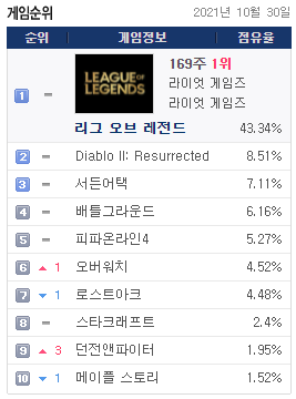 1.리그오브레전드 44.46% ▶ 43.34% (↓1.12%)